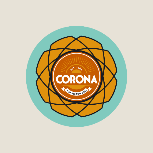 Design: Corona badge over geometric orange blossom